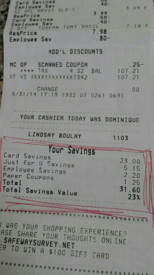 I am really impressed with the Out of Milk app. My shopping list was so easy to use! We clicked on each item and added the price. So, at the end we knew roughly what we were going to spend. I was also able to use a few printed coupons to save a little more. I highly recommend using the Safeway Just 4 U coupons and savings too. In the end, I spent $107.21 and saved over $30 for a weeks worth of groceries. I still have to get a few more items in the middle of the week but it looks like this week I will have some left over for savings. Whoot!